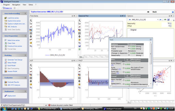 Intelligent Forecaster offers a variety of functions to analyze and transform time series. The functionality includes a variety of time series graphs, a variety of seasonal plots, autocorrelation plots, and PQ-scatter plots. In addition to descriptive time series statistics the functions include automatic tests of stationary series incl. augmented Dickey-Fuller tests, seasonality tests, trend-tests, automatic reporting facilities.  It further offers functions to analyze multiple series ... [find out more]